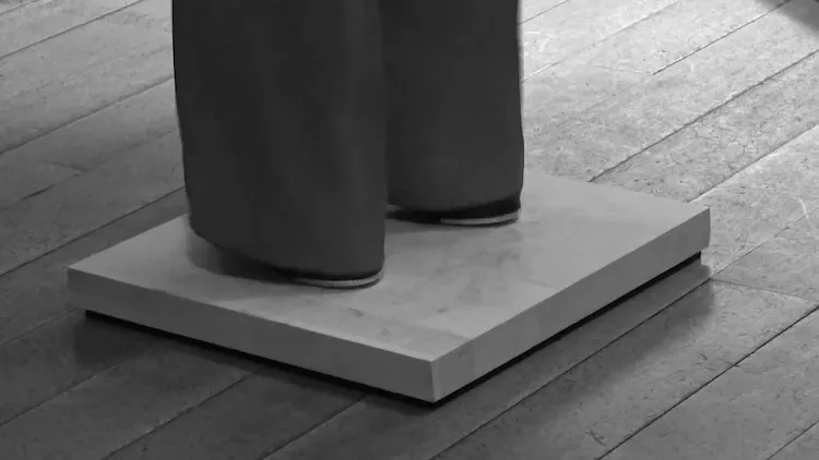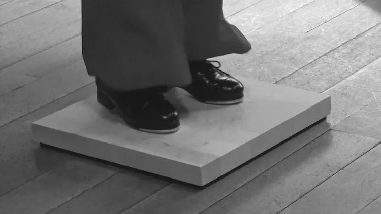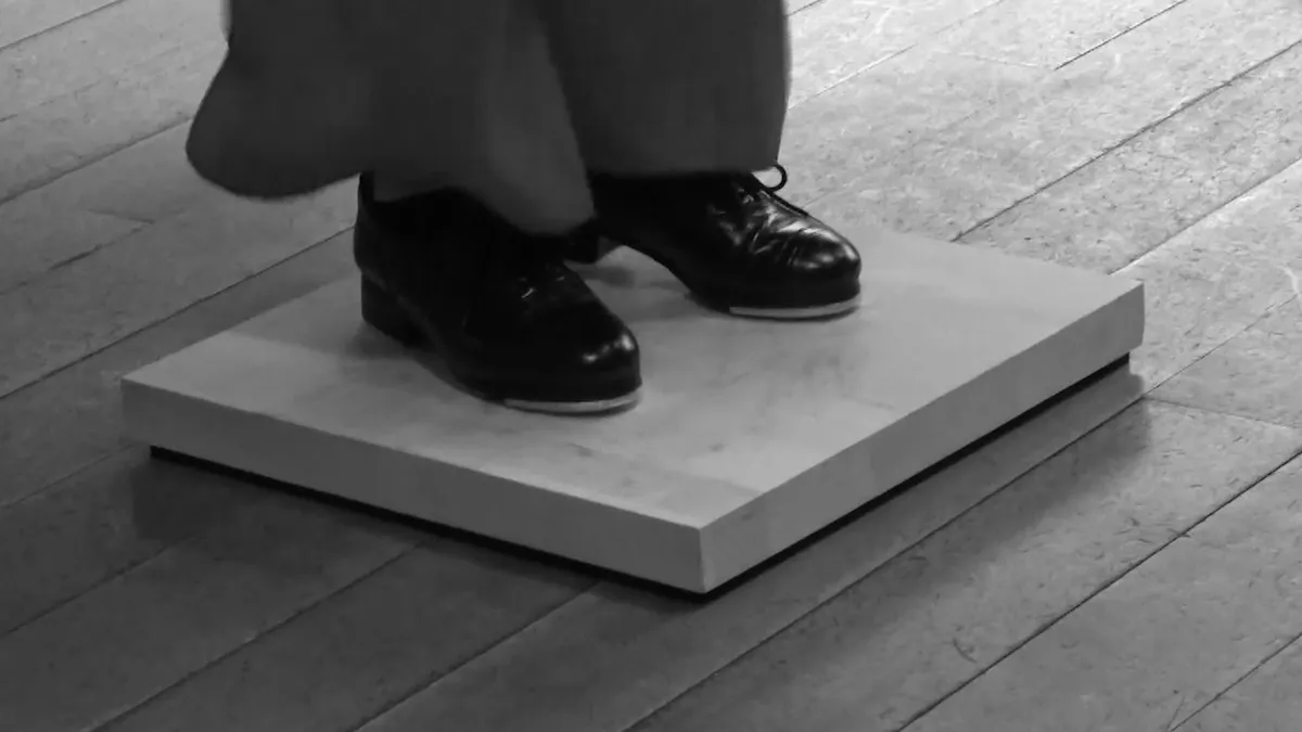 Meyer’s video work Berlin Piece for Voice and Tap Dance presents a close-up of two tap-dancing feet, slowed to accentuate the subtle movements of the trousers rather than the steps. The tiny tap board and the absence of sound create a ghostly, almost spectral presence. Lasting 4.5 minutes and looping seamlessly, the backward and forward motions merge into a continuous, hypnotic flow. Minimal and extremely contained, the movement of the feet is almost imperceptible, while the fabric of the loose trousers produces a hallucinatory, secondary dance. The underlying motion is a fast, constant ticking; the feet themselves do not vary their pattern, reinforcing a sense of constraint and repetition.