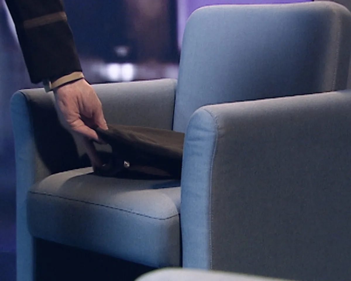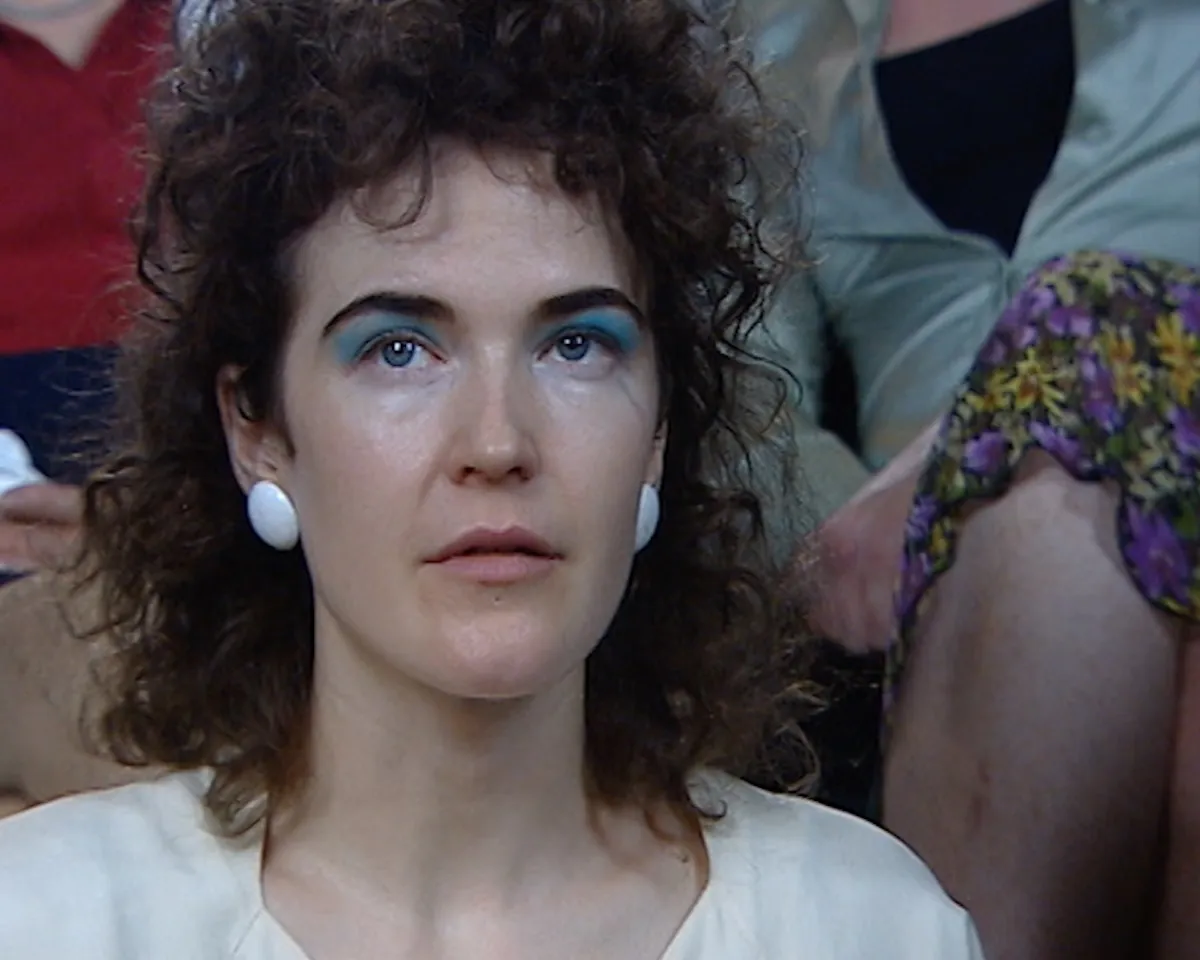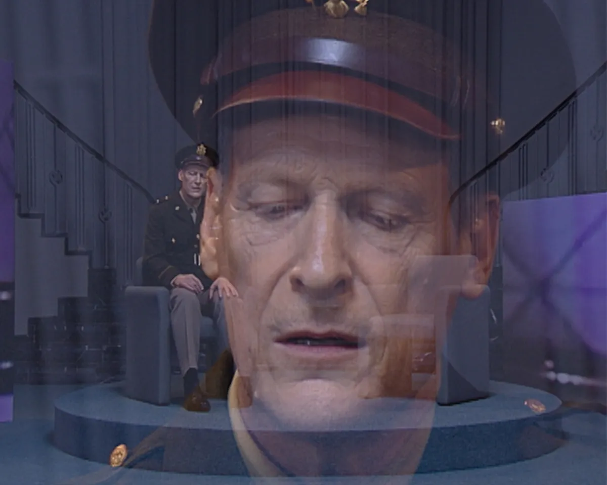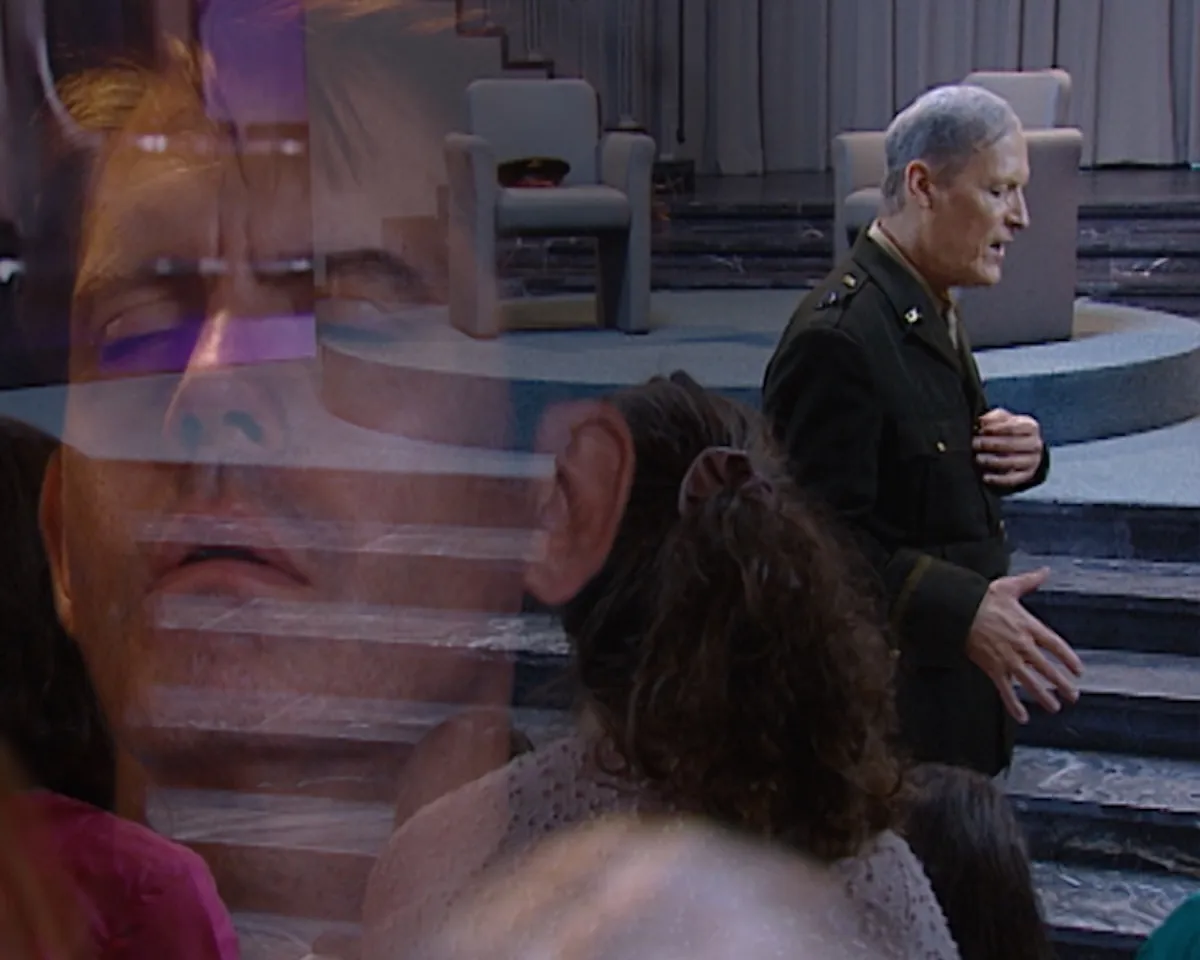 In DISSONANCE Jordan Strafer introduces a talk show host played by Jim Fletcher, dressed in a U.S. soldier’s uniform. After greeting his audience, he leads them through a guided meditation recalling the memory of a first childhood home. Fletcher’s reappearance in DISSONANCE, following his role as defense attorney Ray in Loophole, is an instance of Strafer collapsing characters in her work, a recurring gesture that reflects her sustained interest in their ambiguity and interchangeability.
