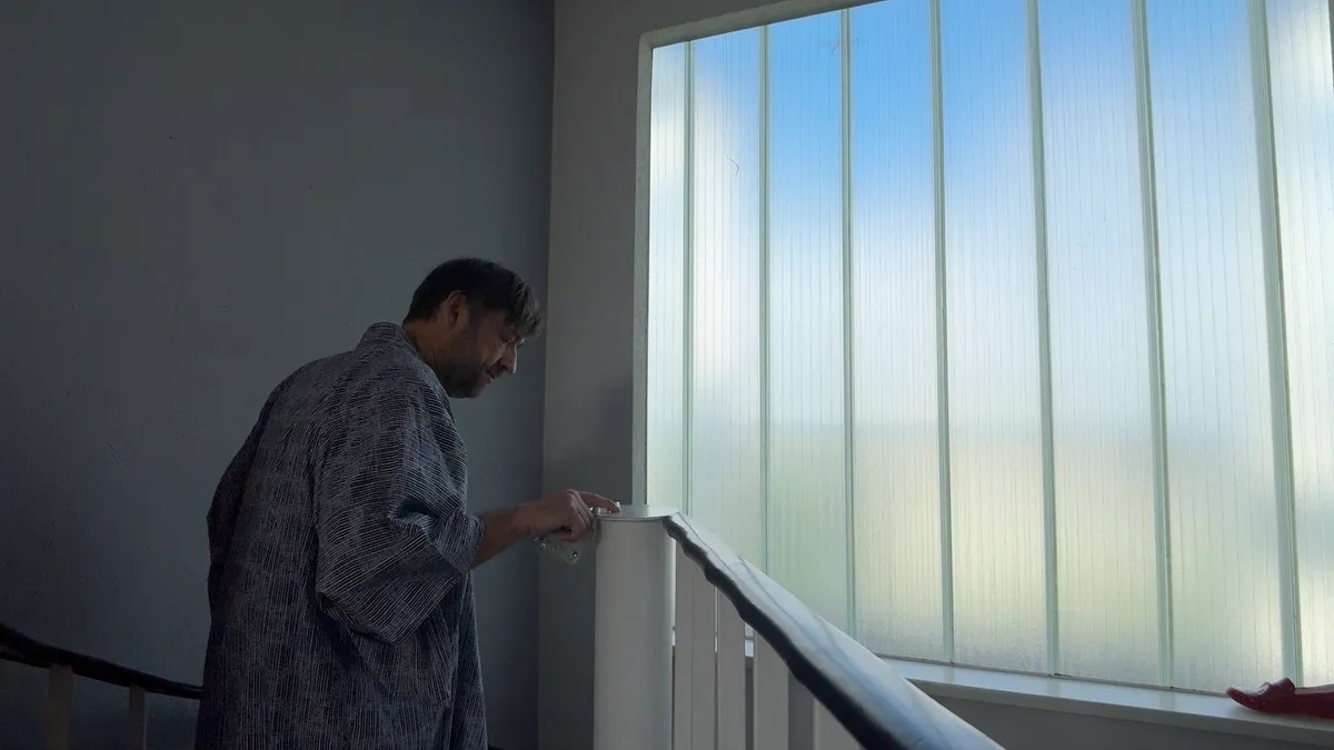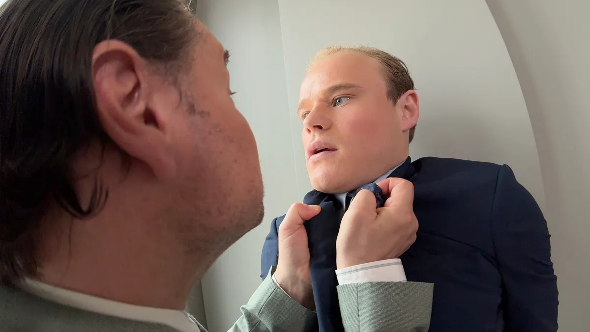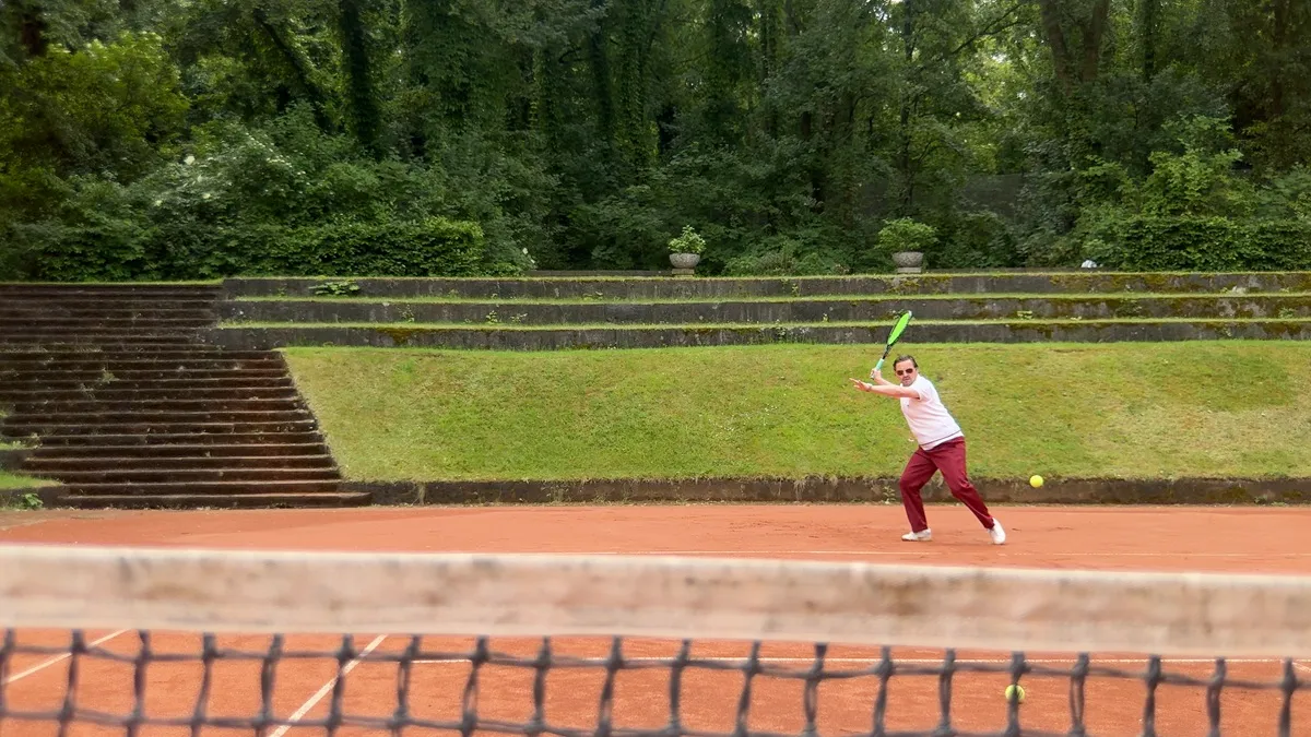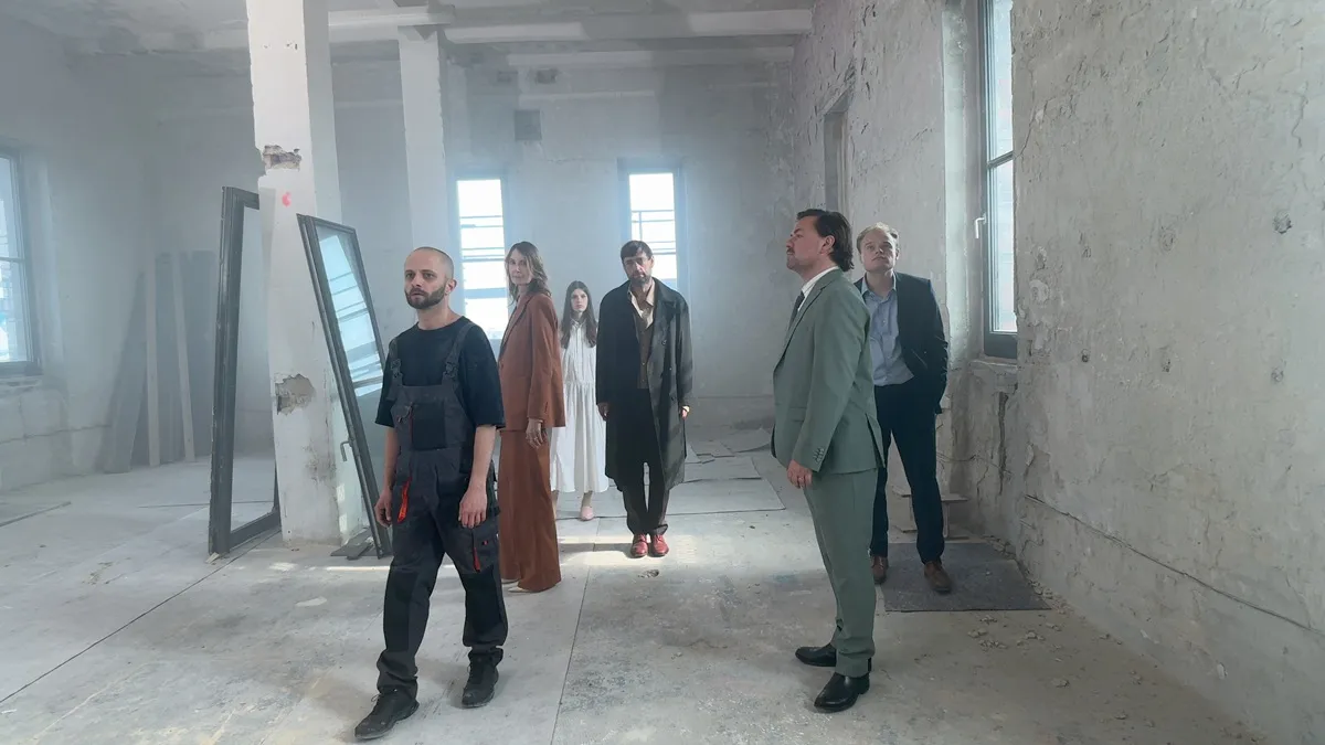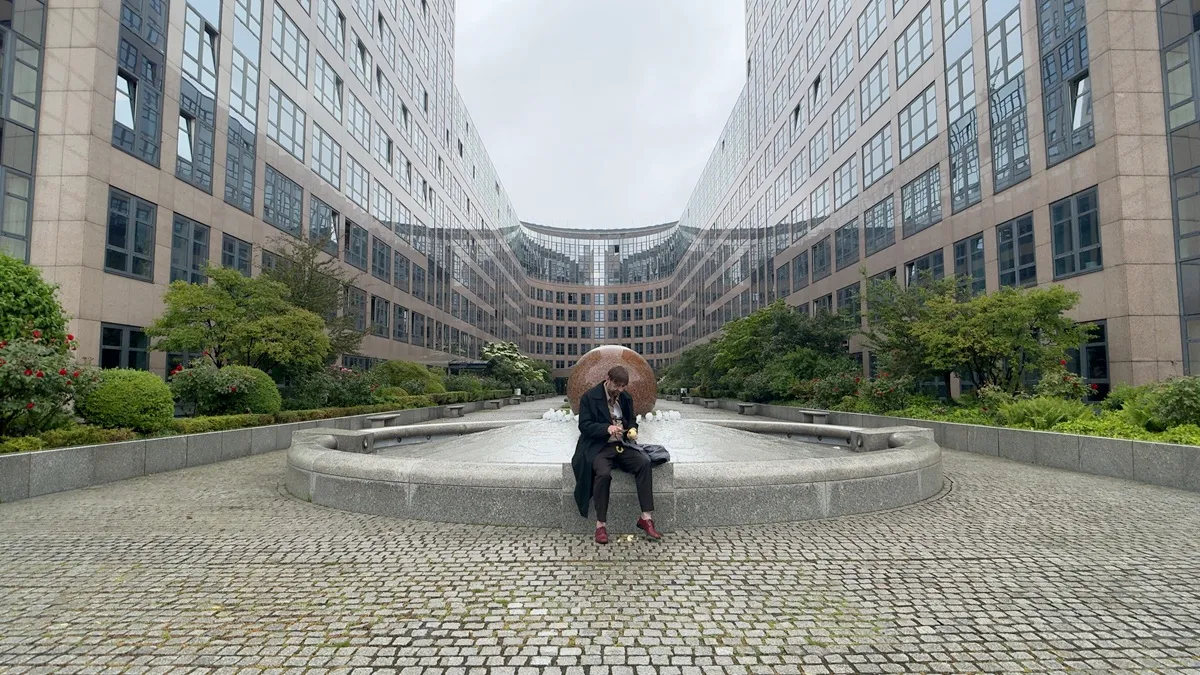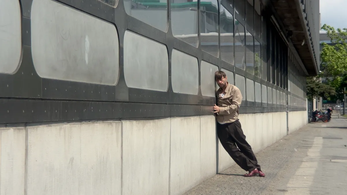In Rough Trade, various settings provide the backdrop for scenes that echo earlier films by Erik Schmidt. The story begins in his apartment, where he packs a bag with mementos, valuables, and bundles of cash. Dressed in a suit and coat, he makes a hurried departure. A theatrical fountain, a tennis court, an open-plan office, and his own apartment become the sites where the protagonist – the artist’s alter ego – meets other figures, themselves recalling earlier films. With them he plays, argues, communicates, and fights.
